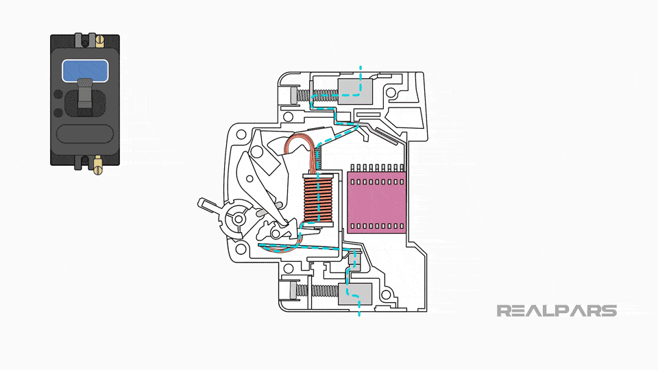 This animation shows the internal mechanism of a circuit breaker and how it automatically cuts off electrical power during a fault.