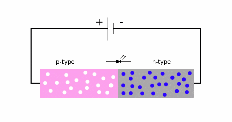 - You can see electrons (blue dots) moving from the n-side and holes (white dots) moving from the p-side. When they meet, light is emitted.