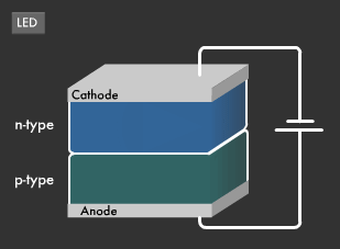 - An LED is made of p-type and n-type semiconductor materials joined together (PN junction).