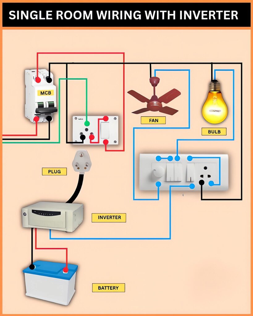 This diagram shows how to wire a single room with an inverter backup system. The setup ensures that essential appliances like a fan and bulb continue working during power outages.